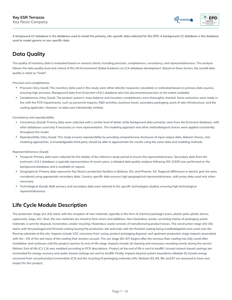 A foreground LCI database is the database used to model the primary, site-specific data collected for this EPD. A background LCI database is the databaseused to model generic or non-specific data.Data QualityThe quality of inventory data is evaluated based on several criteria, including precision, completeness, consistency, and representativeness. The analysisfollows the data quality level and criteria of the UN Environment Global Guidance on LCA database development. Based on these factors, the overall dataquality is rated as "Good”.Precision and completeness:Precision (Very Good): The inventory data used in this study were either directly measured, calculated, or estimated based on primary data sources,ensuring high precision. Background data from Ecoinvent v3.9.1 database also has documented precision to the extent available.Completeness (Very Good): The product system's mass balance and inventory completeness were thoroughly checked. Some exclusions were made inline with the PCR requirements, such as personnel impacts, R&D activities, business travel, secondary packaging, point of sale infrastructure, and thecoating applicator. However, no data was intentionally omitted.Consistency and reproducibility:Consistency (Good): Primary data were collected with a similar level of detail, while background data primarily came from the Ecoinvent database, withother databases used only if necessary or more representative. The modeling approach and other methodological choices were applied consistentlythroughout the model.Reproducibility (Very Good): This study ensures reproducibility by providing comprehensive disclosure of input-output data, dataset choices, andmodeling approaches. A knowledgeable third party should be able to approximate the results using the same data and modeling methods.Representativeness (Good):Temporal: Primary data were collected for the totality of the reference study period to ensure the representativeness. Secondary data from theecoinvent v3.9.1 database is typically representative of recent years, a detailed data quality analysis following ISO 21930 was performed on thebackground database and is available at request.Geographical: Primary data represents Key Resin's production facilities in Batavia, OH, and Phoenix, AZ. Regional differences in electric grid mix wereconsidered using appropriate secondary data. Country-specific data ensures high geographical representativeness, with proxy data used only whennecessary.Technological (Good): Both primary and secondary data were tailored to the specific technologies studied, ensuring high technologicalrepresentativeness.Life Cycle Module DescriptionThe production stage (A1-A3) starts with the reception of raw materials, typically in the form of chemical packages (cans, plastic pails, plastic drums,supersacks, bags, etc). Next, the raw materials are mixed to form resins and additives. Non-hazardous waste, consisting mainly of packaging wastematerials, is sent for disposal, incineration, and/or recycling. Hazardous waste consists of manufacturing product losses. The construction stage (A4-A5)starts with the packaged and finished coating leaving the production site and ends with the finished coating being installed/applied and cured onto theflooring substrate at the site. Impacts include VOC emissions from curing, product packaging disposal, and upstream production stage impacts associatedwith the ~2% of the wet mass of the coating that remains unused. The use stage (B1-B7) begins after the resinous floor coating has fully cured afterinstallation and continues until the product reaches its end-of-life stage. Impacts include all cleaning and necessary recoating events during the servicelifetime. End-of-life (C1-C4) was modeled according to PCR descriptions. Product at the end of life is sent to landfill. Unused solvent-based coatings areincinerated for energy recovery and water-based coatings are sent to landfill. Finally, impacts beyond system boundaries (Module D) include energyrecovered from unused product incineration (C3) and the recycling of packaging materials (A5). Modules B3, B5, B6, and B7 are assumed to have zeroimpact for this product.Key ESR TerrazzoKey Resin CompanyPage 7 / 19