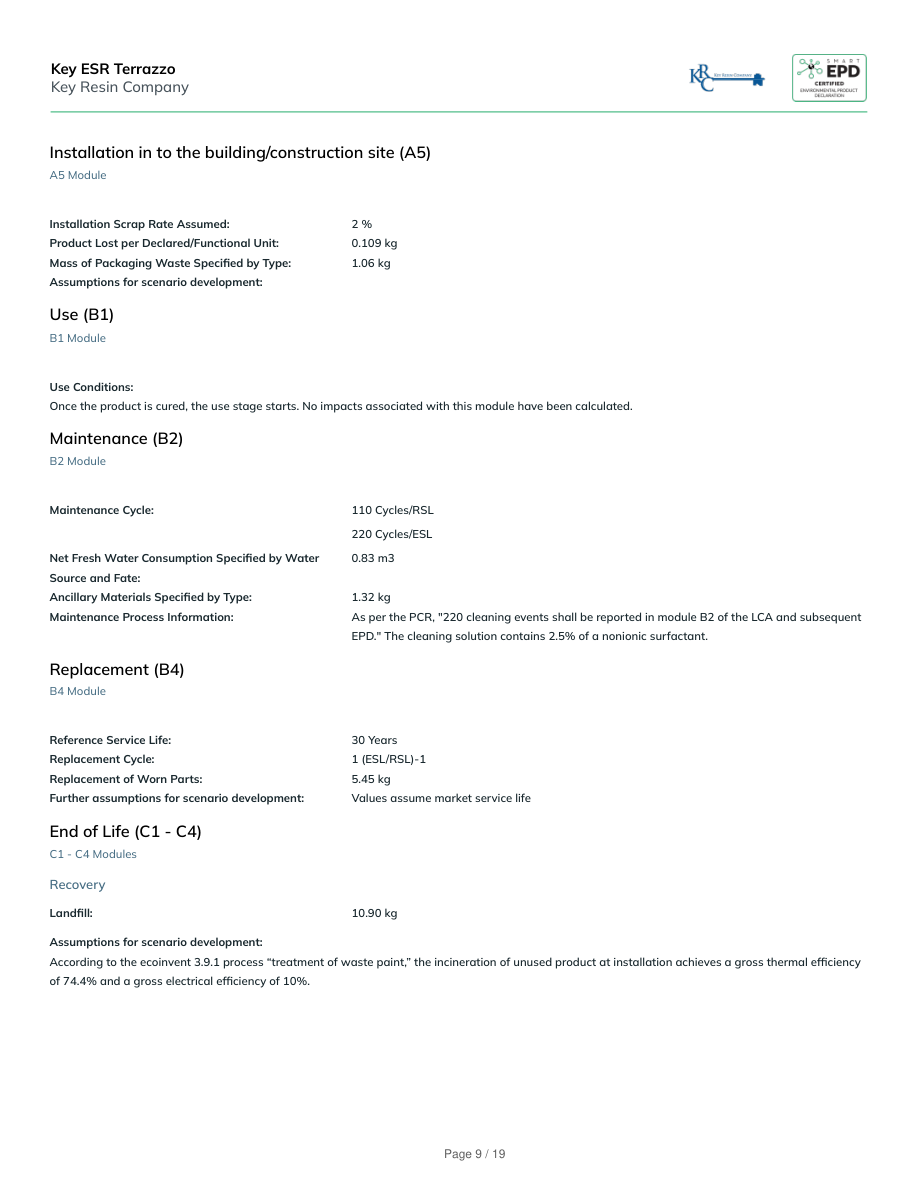 Installation in to the building/construction site (A5)A5 ModuleInstallation Scrap Rate Assumed:2 %Product Lost per Declared/Functional Unit:0.109 kgMass of Packaging Waste Specified by Type:1.06 kgAssumptions for scenario development:Use (B1)B1 ModuleUse Conditions:Once the product is cured, the use stage starts. No impacts associated with this module have been calculated.Maintenance (B2)B2 ModuleMaintenance Cycle:110 Cycles/RSL220 Cycles/ESLNet Fresh Water Consumption Specified by WaterSource and Fate:0.83 m3Ancillary Materials Specified by Type:1.32 kgMaintenance Process Information:As per the PCR, "220 cleaning events shall be reported in module B2 of the LCA and subsequentEPD." The cleaning solution contains 2.5% of a nonionic surfactant.Replacement (B4)B4 ModuleReference Service Life:30 YearsReplacement Cycle:1 (ESL/RSL)-1Replacement of Worn Parts:5.45 kgFurther assumptions for scenario development:Values assume market service lifeEnd of Life (C1 - C4)C1 - C4 ModulesRecoveryLandfill:10.90 kgAssumptions for scenario development:According to the ecoinvent 3.9.1 process “treatment of waste paint,” the incineration of unused product at installation achieves a gross thermal efficiencyof 74.4% and a gross electrical efficiency of 10%.Key ESR TerrazzoKey Resin CompanyPage 9 / 19